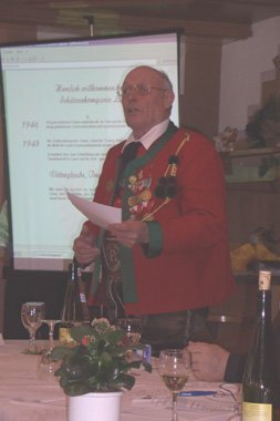 Winfried Wenkmann, Oberschützenmeister des Schützenvereins Edelweiß-Hohenkemnath e.V. dankte in Vertretung seiner Schützenkameraden für die Einladung und betonte, dass der Hauptgrund für ihr zahlreiches Erscheinen die Freundschaft mit der Kompanie sei. Wenkmann dankte der Kompanie nochmals für den gelungenen Auftritt beim Gründungsjubiläum im Sommer des vergangenen Jahres und überreichte Hptm. Herbert Federspieler eine Videokassette als Erinnerung.